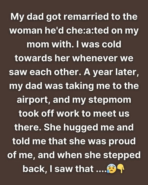 A year later, my dad was taking me to the airport on my way to college, and my stepmom took off work to meet us there and send me off with a care package. She hugged me and told me that she was proud of me, and when she stepped back, I saw that she had tears in her eyes.