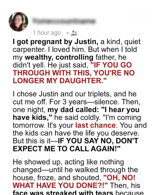 When I told my dad I was pregnant by Justin—a quiet carpenter—he disowned me. For three years, silence. No calls.