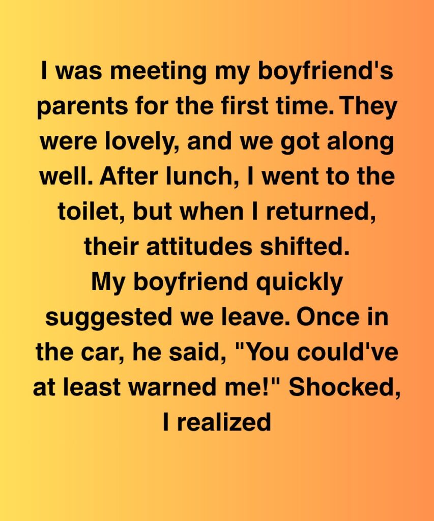 I was meeting my boyfriend’s parents for the first time. They were lovely, and we got along well. After lunch,