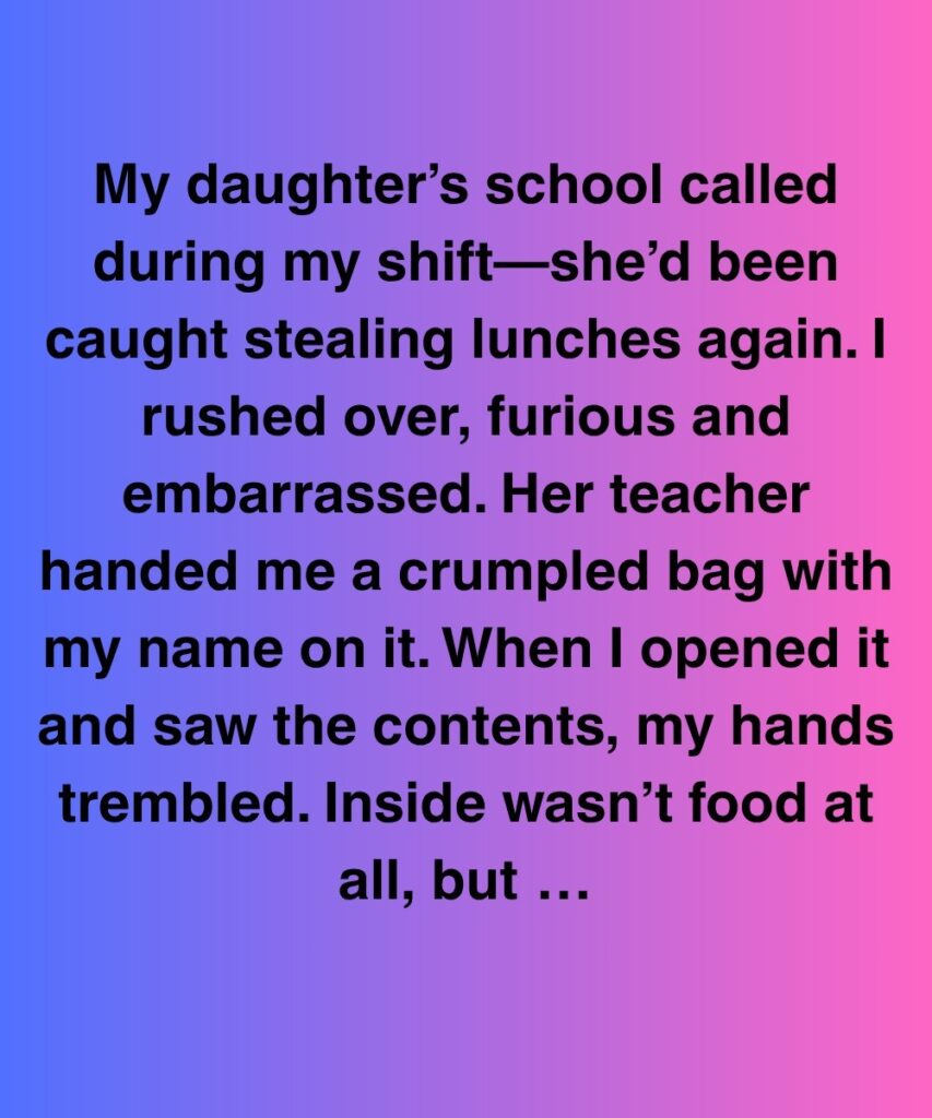 My daughter’s school called during my shift—she’d been caught stealing lunches again. I rushed over, furious and embarrassed. Her teacher