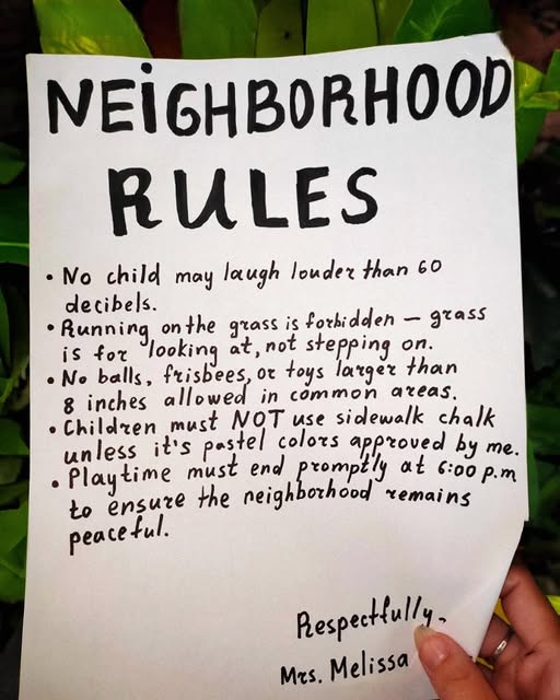 One morning Dave called me to the front door, his face twisted into something between shock and disgust. Taped to the door was a white envelope with my name written in neat cursive. Inside was a typed list titled “NEIGHBORHOOD RULES.” I thought it was some kind of HOA guideline until I started reading. Rule number one: “No child may laugh louder than 60 decibels.” Rule two: “Running on grass is forbidden—it is for looking at, not stepping on.” Rule three: “No balls, frisbees, or toys larger than eight inches allowed in common areas.” Rule four: “Sidewalk chalk is permitted only in pastel colors pre-approved by me.” Rule five: “Playtime must end by 6:00 p.m. sharp to preserve neighborhood peace.”