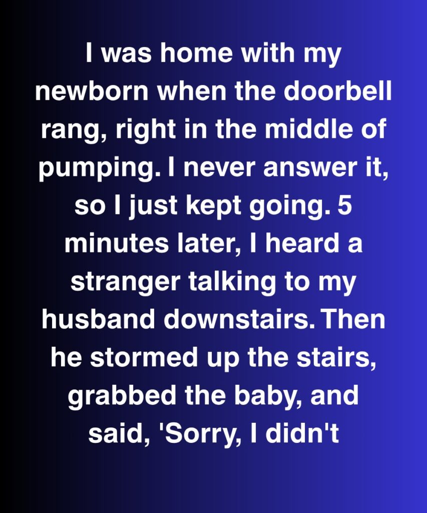I was home with my newborn when the doorbell rang, right in the middle of pumping. I never answer it, so I just kept going. Five minutes later, I heard a stranger talking to my husband downstairs. Then he stormed up the stairs, grabbed the baby, and said, “Sorry, I didn’t…”