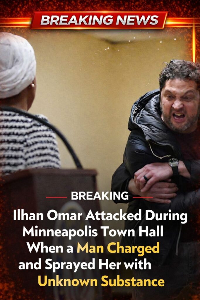 The attack on Ilhan Omar unfolded in seconds, but its echoes cut straight into a country already on edge. She had just demanded the abolition of ICE and the removal of the DHS secretary when the man rushed her, syringe in hand, releasing a strong-smelling substance across her shirt before being slammed to the floor by security. As staff urged her to step away and be examined, Omar pushed back, insisting they not “let them have the show,” choosing to finish her remarks in front of a shaken crowd.
