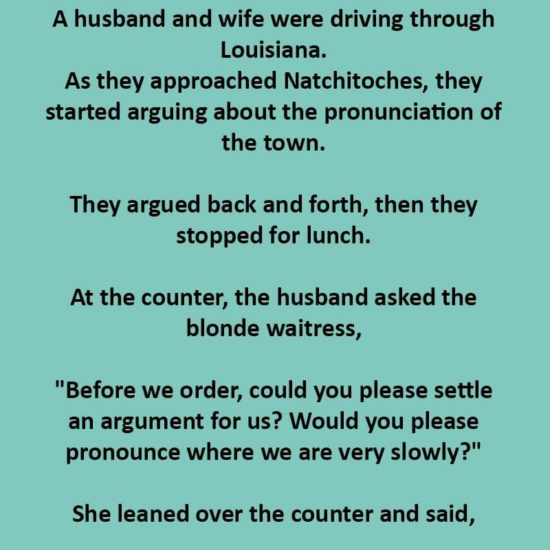 A husband and wife were driving through Louisiana when they reached a small town called Broussard. As they approached the town, they began to argue heatedly about how to pronounce it. The husband insisted it was “Broo-sar,” while his wife argued for “Brew-sard.” Their bickering grew so intense that they decided to stop for lunch at a local diner.
